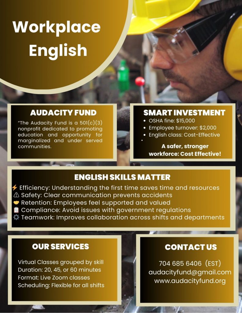 Language barriers are more than just a communication hurdle—they are a financial and operational risk. The Audacity Fund partners with your company and creates industry-specific, online English training. Training that is designed to protect your workforce and your profit margins.
